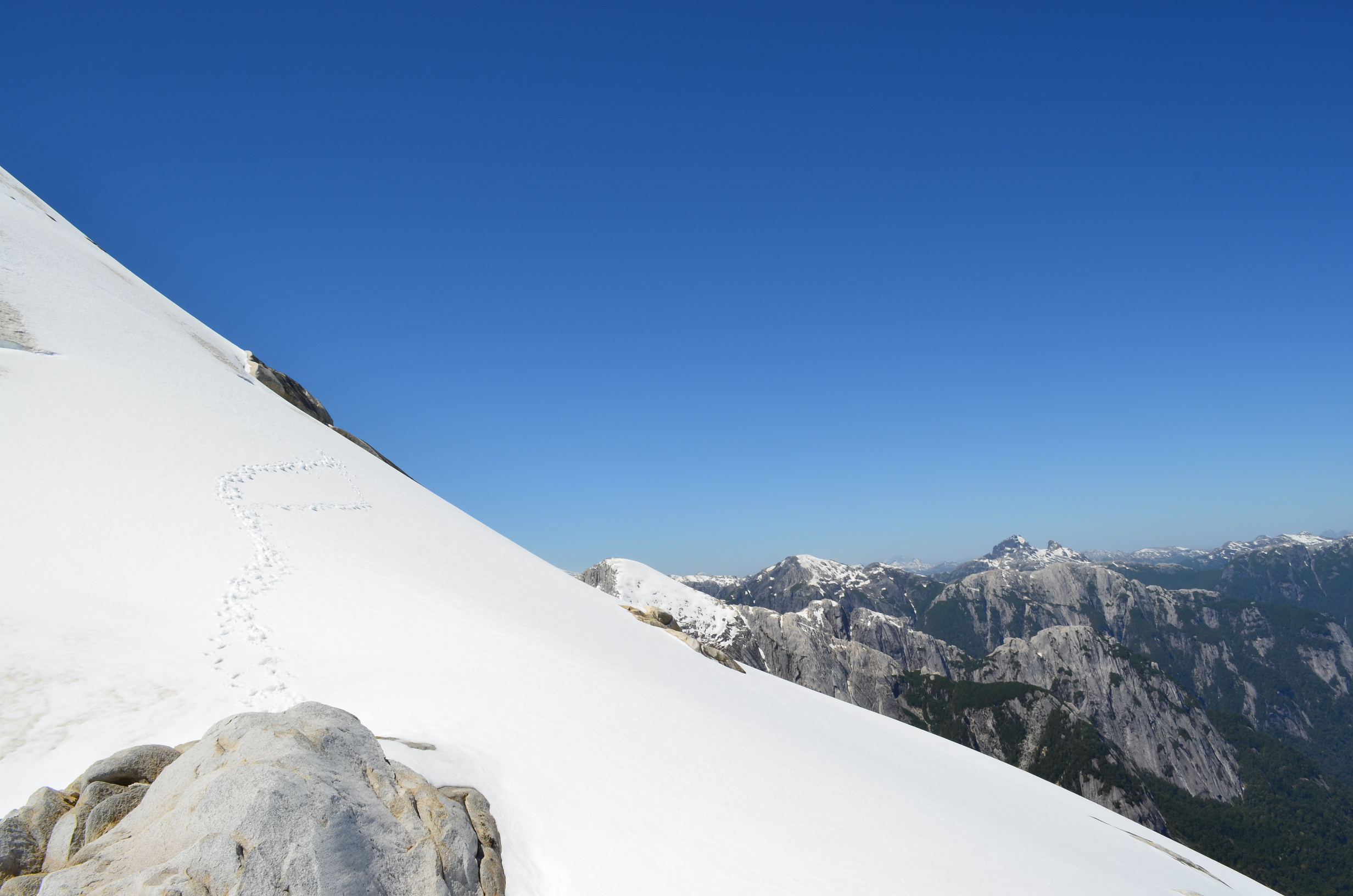 When I finally make it to the summit block there is a problem. The final slope is both very steep and covered in snow, with the usual soft layer over hard packed. It is also unclear which sections of snow are secure and which ones might slide right off.
