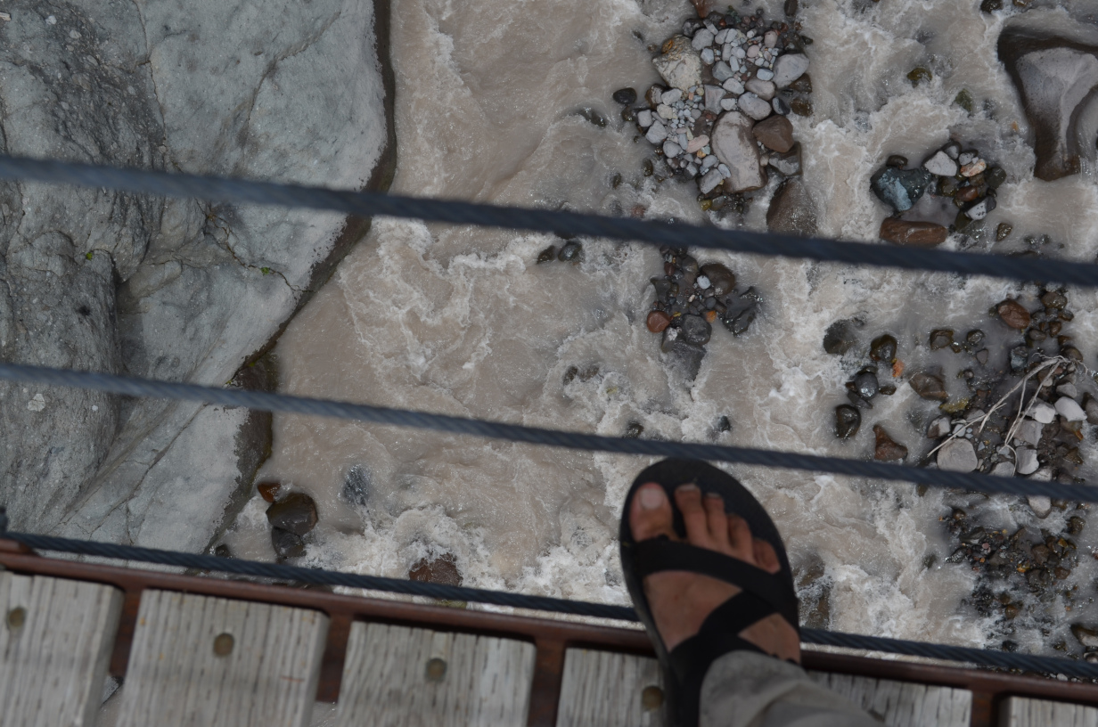 Crossing the Tahoma Creek Suspension Bridge. The creek was further down than it looks in this photo.