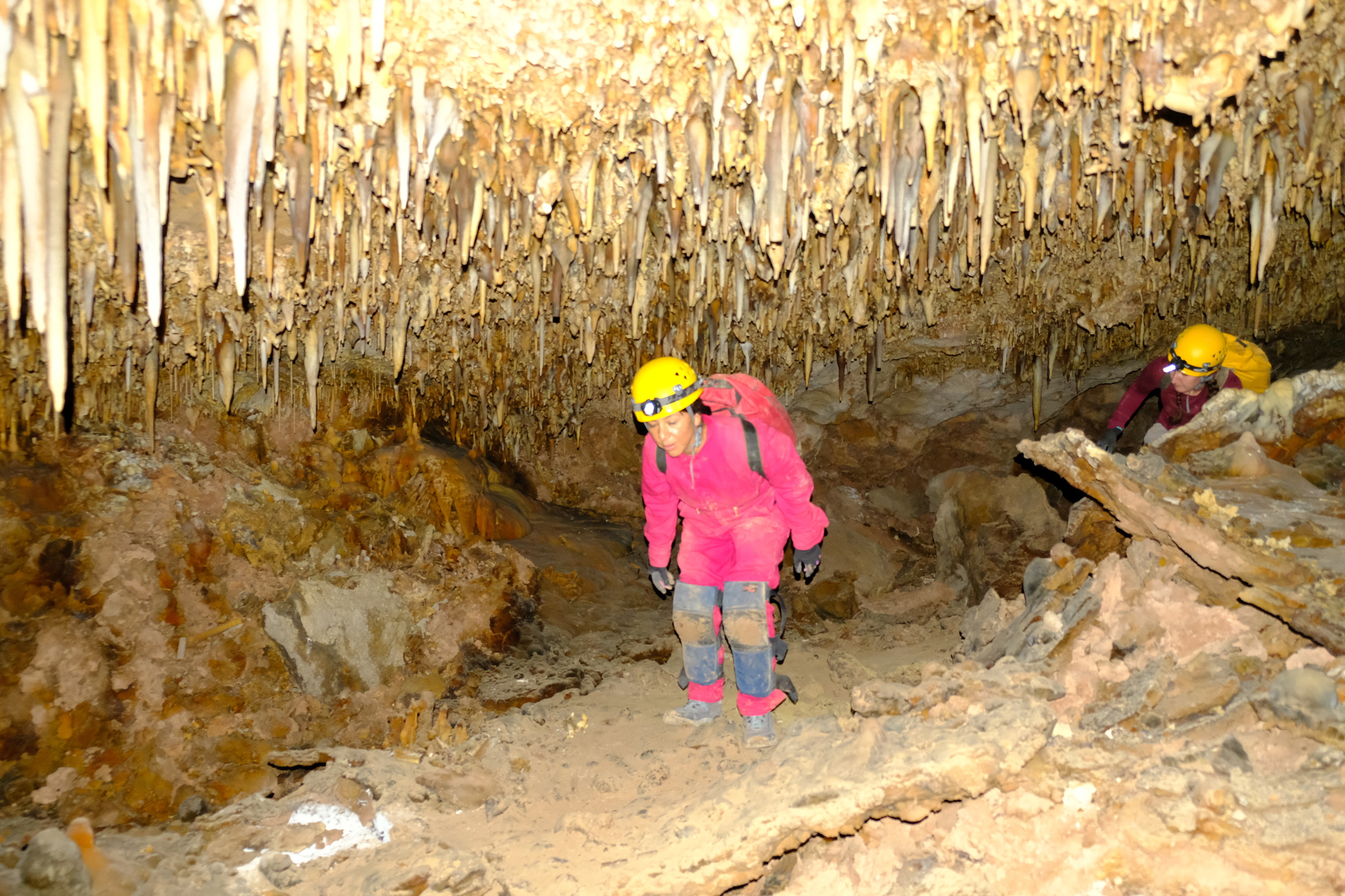 Eshani was most pleased to find a formation taller than herself. The trail markers we installed can be seen in the background. While it took a few more markers than we like, this section of the cave has had a lot of trouble with people getting off route.