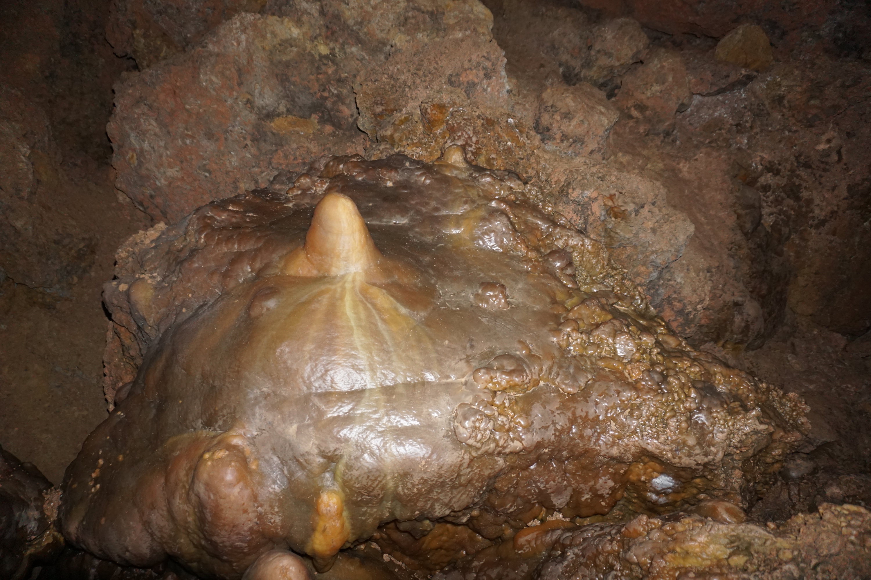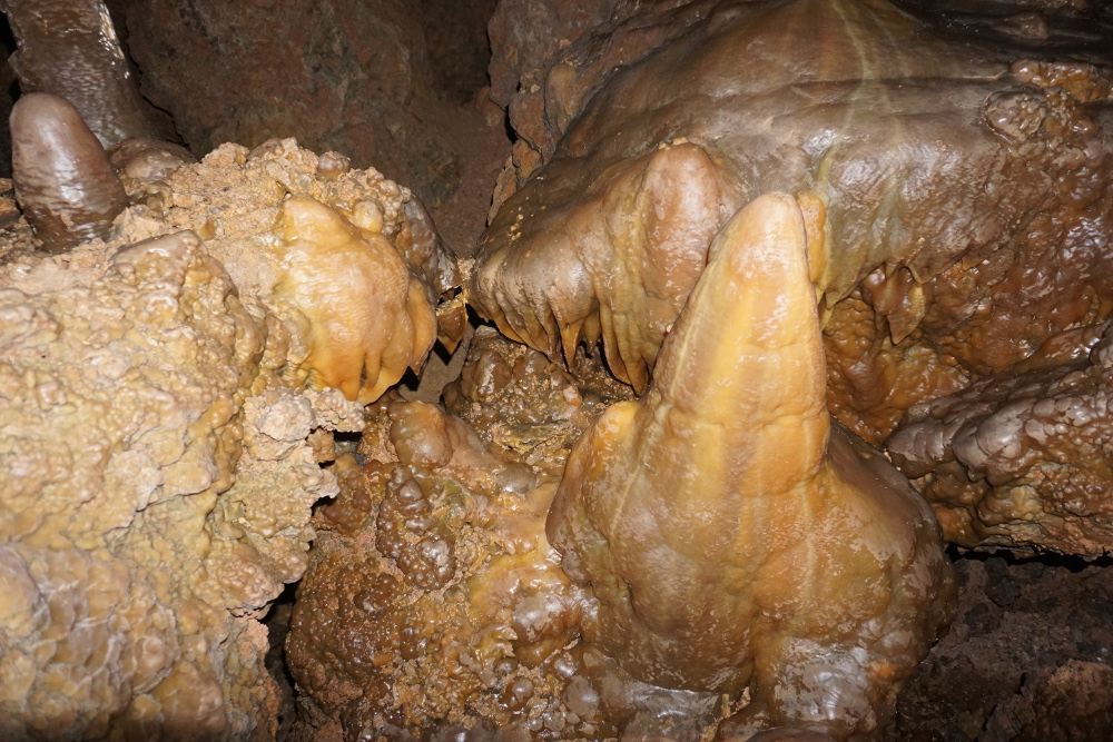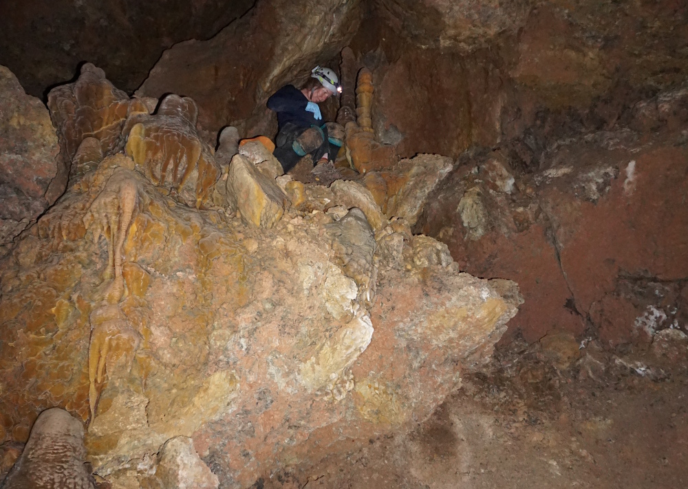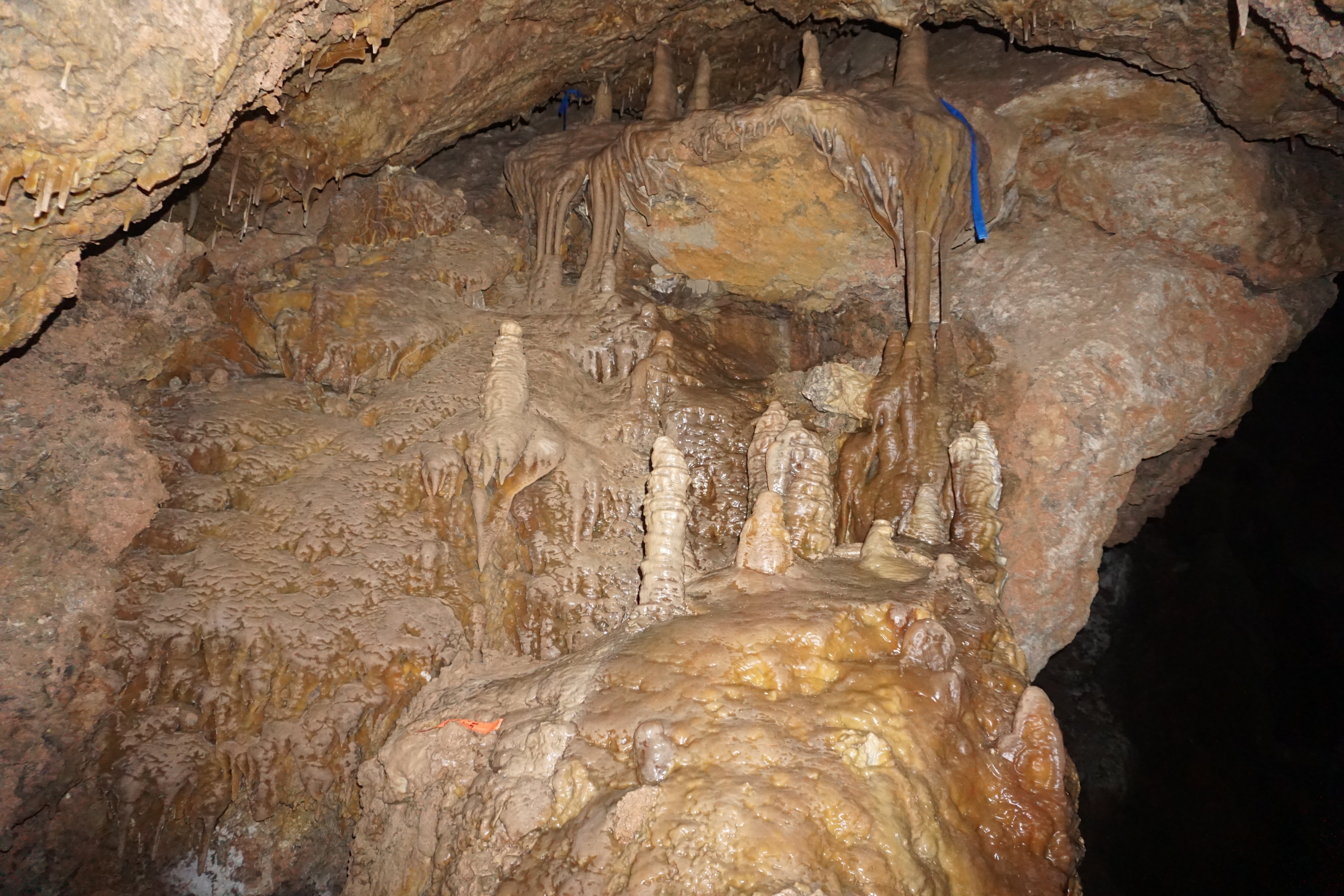 While the prior public access provided an extremely valuable caving opportunity to thousands of people, it came with a price: the damage caused by the irresponsible spelunkers that entered the cave. For whatever reason, they climbed all over the formations in Trophy Room, coating the colorful cave velvet with mud. The senselessness of this is remarkable. It is as though they went out of their way to walk all over everything; most of what they trampled is clearly not on a path to anything. They even attempted the crime of removing a stalagmite. Thankfully they were unable to break it off, but the damage done is still tragic.