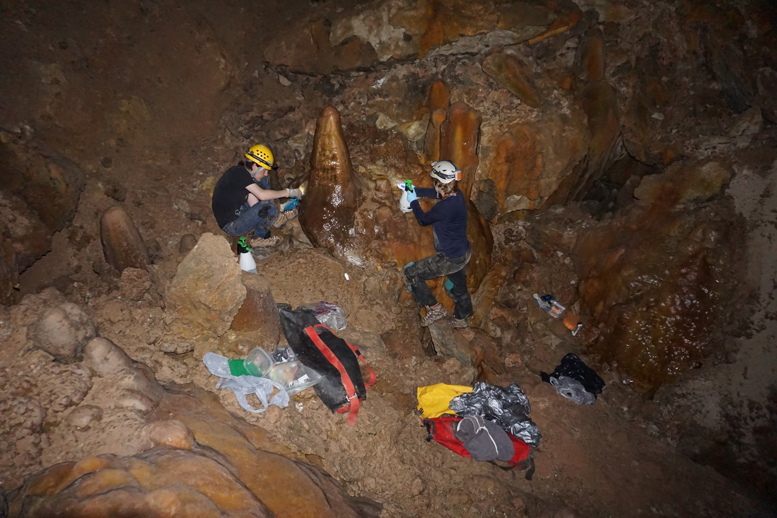 Restoration is hard work. Water had to be carried through all of the crawls to Trophy Room. Then a combination of spray bottles, brushes, and sponges is used to scrub the mud off. Extreme care must be taken to prevent further damage. Often a toothbrush is necessary to gently access the nooks and cranies of convoluted formations. The sponges are used to soak up the mud water - but you must resist the temptation to scrub with them as the rock will tear material off the sponge, contaminating the cave. Unlike the outside world, foreign materials have a huge impact on the fragile cave environment.