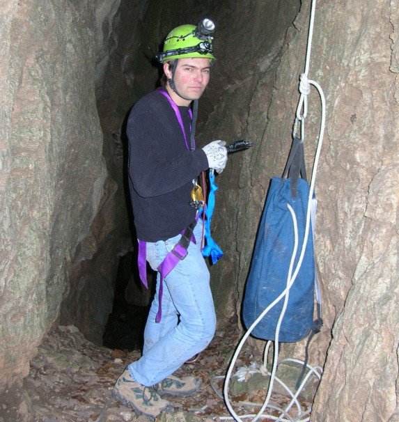 For those of you not familiar with vertical caving, he had two ascenders locked on to the rope keeping him safe when this picture was taken.